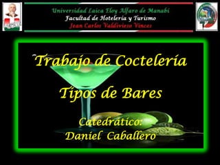 El documento describe diferentes tipos de bares, incluyendo el bar americano, caracterizado por una larga barra, mesas aisladas y servicio informal; el bar discoteca, apreciado por los jóvenes para bailar y conocer amigos y enfocado en la venta de bebidas alcohólicas; el bar cafetería, que sirve bebidas y comidas ligeras para consumo rápido; el lobby bar ubicado en hoteles; el bar pub inglés que sirve a todas las clases sociales con pequeñas comidas y entretenimiento; y el novedoso