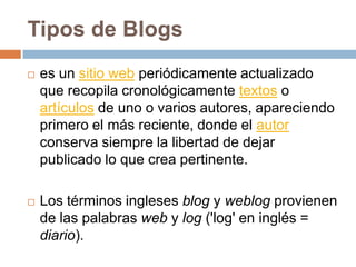 Este documento describe los diferentes tipos de blogs, incluyendo blogs personales, microblogs, blogs corporativos u organizacionales, blogs por género como de música o arte, blogs por tipo de medios como vlogs o fotologs, blogs por dispositivo como moblogs, y blogs inversos escritos por múltiples autores. Explica que un blog es un sitio web periódicamente actualizado que recopila artículos de uno o más autores de forma cronológica, y que puede incluir comentarios y características como enlaces, fotos, videos y