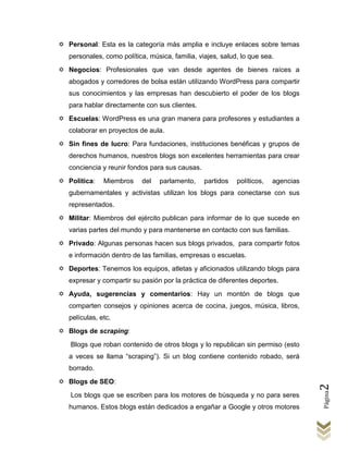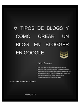 Este documento describe los diferentes tipos de blogs y cómo crear uno en Blogger de Google. Explica que hay blogs personales, de negocios, escuelas, sin fines de lucro, política, militares y más. Luego detalla los pasos para crear una cuenta de Google y un blog en Blogger, incluyendo agregar un título, dirección y plantilla. Finalmente, cubre cómo agregar entradas al blog con títulos, texto, etiquetas e imágenes y publicarlas.