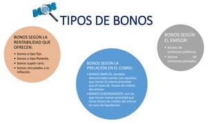 Existen varios tipos de bonos según su rentabilidad, prelación en el cobro, emisor, divisa y otros factores. Los principales tipos incluyen bonos a tipo fijo, bonos a tipo flotante, bonos cupón cero, bonos vinculados a la inflación, bonos simples, bonos subordinados, bonos de emisores públicos y privados, bonos en moneda local y extranjera. En el mercado peruano, los bonos de productividad y permanencia son comunes.