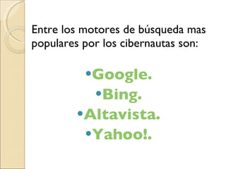 Los motores de búsqueda más populares son Google, Bing, Altavista y Yahoo. Google es el más utilizado debido a su gran número de resultados para cualquier tema. Fue fundado en 1998 por Larry Page y Sergey Brin. Bing es el sustituto de Live Search lanzado por Microsoft en 2009. Altavista es un buscador en inglés y español propiedad de Yahoo. Yahoo es una empresa global fundada en 1994 que ofrece un portal, directorio y servicios como correo electrónico.