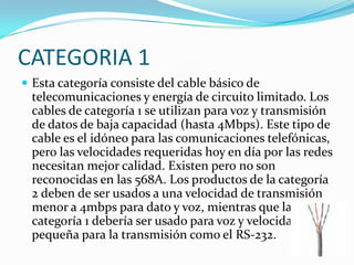 La categoría 1 consiste en cable básico para voz y datos de baja velocidad (hasta 4Mbps). La categoría 2 puede transmitir datos hasta 4 Mbit/s. La categoría 3 puede transportar datos de hasta 10Mbit/s. La categoría 5 puede transmitir datos a velocidades de hasta 100 Mbps. La categoría 6 puede alcanzar velocidades de 1Gbps. La categoría 7 puede permitir 10 Gigabit Ethernet sobre 100 metros.