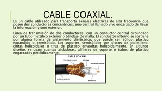 El documento describe diferentes tipos de cables de red, incluyendo cable coaxial delgado y grueso, cable trenzado sin blindaje (UTP), cable trenzado con blindaje (STP), cable trenzado no apantallado (FTP) y fibra óptica. El cable coaxial delgado se usa para redes Ethernet de 10 Mbps, mientras que el cable coaxial grueso puede usarse para redes más grandes de hasta 500 metros. El UTP es el tipo de cable más común y se usa en categorías para diferentes velocidades de transmisión de datos. La fibra