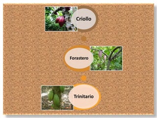 El documento describe tres tipos de cacao: cacao de Venezuela, cacao criollo y cacao trinitario. El cacao de Venezuela tiene piñas de color violeta con 20-30 granos por piña y un sabor agradable. El cacao criollo tiene granos ácidos y pequeños, y es resistente a enfermedades. El cacao trinitario es un híbrido entre criollo y forastero que es muy resistente a plagas y tiene un aroma fuerte y sabor amargo.