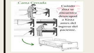 Este documento describe los diferentes tipos de tendidos de cama en una unidad clínica, incluyendo cama cerrada, cama abierta, cama ocupada y cama de anestesia. Explica los objetivos, precauciones, equipo necesario y los pasos para cada procedimiento, con el fin de preparar la cama de manera limpia y segura para el paciente.