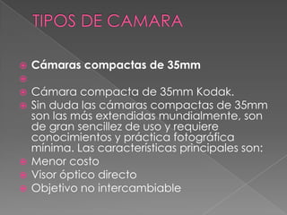 Este documento describe los diferentes tipos de cámaras fotográficas, incluyendo cámaras compactas de 35mm, cámaras APS, cámaras réflex SLR, cámaras digitales, cámaras TLR, cámaras de estudio, cámaras miniatura, cámaras panorámicas y más. También explica componentes clave como lentes, diafragmas, velocidad de obturación, ángulos, planos y leyes de composición.