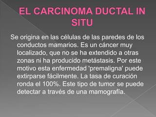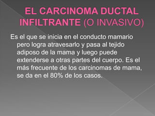 Este documento describe diferentes tipos de cáncer de mama, incluyendo el carcinoma ductal in situ que se origina en las células de los conductos mamarios pero no se ha extendido, el carcinoma ductal invasivo que se extiende más allá del conducto, el carcinoma lobular in situ que se origina en las glándulas mamarias y aumenta el riesgo de cáncer futuro, y el carcinoma inflamatorio poco común que causa enrojecimiento e hinchazón de la piel de la mama.