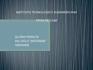 Este documento describe los diferentes tipos de gabinetes o "cases" para computadoras, incluyendo ATX Desktop, ATX Full, ATX Media Center, ATX Mid, ATX Mini, BTX, MicroATX Desktop, MicroATX Slim, y Mini-ITX. Cada tipo se diferencia en su tamaño, capacidad de almacenamiento y propósito, como ser usado para home theaters, escritorios regulares, o sistemas pequeños con menos espacio. Todos los casos sirven para proteger y almacenar los componentes internos de una computadora.