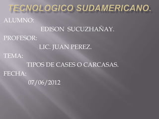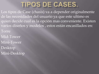 El documento describe los diferentes tipos de case o carcasas para computadoras, incluyendo torre, mid-tower, mini-tower, desktop y mini-desktop. Cada tipo varía en tamaño y número de bahías para unidades de almacenamiento y lectura. El tipo apropiado depende de las necesidades del usuario o empresa.