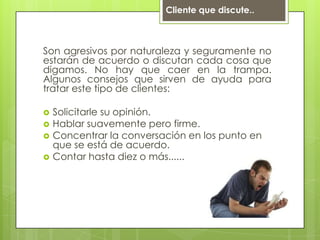 El documento ofrece consejos para tratar diferentes tipos de clientes, incluyendo clientes que discuten, enojados, conversadores, ofensivos, infelices, que siempre se quejan y coqueteadores. Recomienda escuchar la opinión de los clientes que discuten, no enojarse con los enojados, mostrar interés en los conversadores, ser amable con los ofensivos, ayudar a los infelices y mantener una actitud profesional con los coqueteadores.