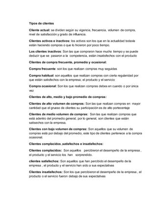 El documento describe diferentes tipos de clientes clasificados según su vigencia, frecuencia de compra, volumen de compra, nivel de satisfacción y grado de influencia. Incluye clientes activos e inactivos, de compra frecuente, promedio y ocasional, de alto, medio y bajo volumen de compras, complacidos, satisfechos e insatisfechos, influyentes y potenciales.