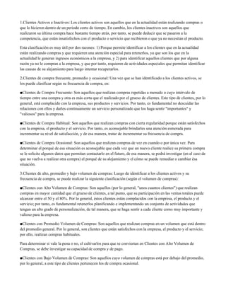 Este documento describe diferentes tipos de clientes que pueden tener las empresas según su relación actual o futura con la empresa. Explica que los clientes se pueden clasificar en dos grupos generales: clientes actuales, que generan ingresos actualmente, y clientes potenciales, que podrían generar ingresos en el futuro. Luego profundiza describiendo diversas formas más específicas de clasificar a los clientes actuales, como por frecuencia de compra, volumen de compra, nivel de satisfacción, e influencia. También describe formas de clasificar a los