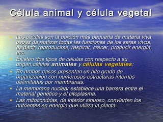 Las células animales y vegetales comparten características como membranas y organelos, pero difieren en aspectos clave. Las células vegetales poseen cloroplastos que les permiten realizar fotosíntesis, una pared celular rígida de celulosa y una gran vacuola central, mientras que las células animales carecen de estos elementos y tienen varias vacuolas más pequeñas. Otra diferencia es que las células vegetales se reproducen de forma asexual dando células idénticas, mientras que las animales lo hacen