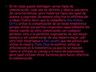 El documento describe tres tipos principales de comunicación - visual, auditiva y kinestésica. Explica que cada persona tiende a usar un estilo en particular, como Ana Milena Ortiz que usa la comunicación kinestésica a través de gestos con las manos. También sugiere regalos apropiados para cada estilo, como gafas o libros para los visuales y instrumentos musicales para los auditivos. Finalmente, clasifica algunos ejemplos como el noticiero (visual), hablar con un amigo (kinestésico) y una conferencia (auditiva).