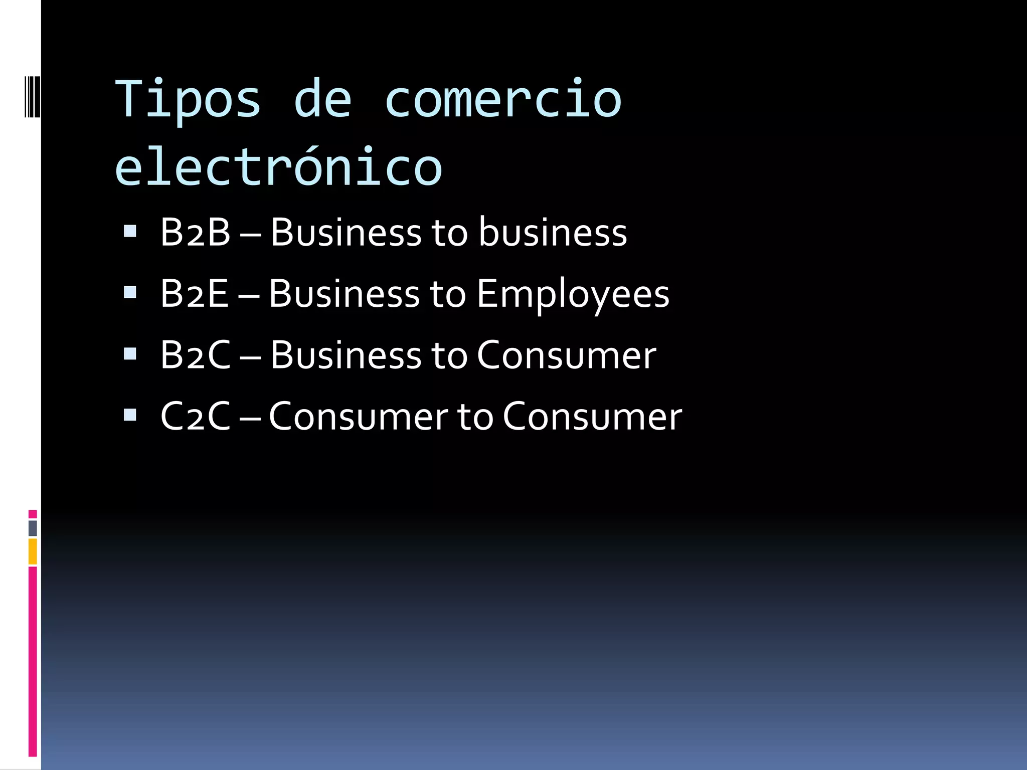 El documento resume los tipos de comercio electrónico como B2B, B2E, B2C y C2C, la tecnología utilizada como EDI, correo electrónico, EFT, aplicaciones web y multimedia, y las principales empresas como eBay, Amazon, Google y Yahoo. También enumera los 10 errores más comunes del comercio electrónico como tener un diseño de sitio pobre, problemas de usabilidad, obstáculos para comprar, falta de mercadotecnia y servicio al cliente.