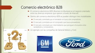 El documento describe los diferentes tipos de comercio electrónico: B2B (negocio a negocio), B2C (negocio a consumidor), B2A (negocio a administración), B2E (negocio a empleado), C2C (consumidor a consumidor), C2G (consumidor a gobierno), B2G (negocio a gobierno) y G2G (gobierno a gobierno). Cada uno involucra transacciones entre diferentes actores a través de Internet.