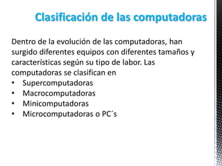 Este documento clasifica las computadoras en supercomputadoras, macrocomputadoras, minicomputadoras y microcomputadoras. Las supercomputadoras son las más poderosas y se usan para cálculos complejos. Las macrocomputadoras o mainframes manejan grandes cantidades de datos de entrada y salida. Las minicomputadoras son versiones más pequeñas que soportan de 10 a 200 usuarios. Las microcomputadoras, como las PC y laptops, se usan comúnmente en oficinas, escuelas y hogares.