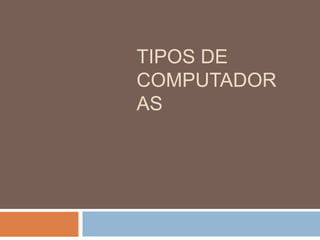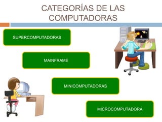 Este documento describe las principales categorías de computadoras: supercomputadoras, mainframes, minicomputadoras y microcomputadoras. Las supercomputadoras son las más rápidas y caras, utilizadas para simulaciones científicas. Las mainframes son computadoras grandes usadas por hospitales, aerolíneas y universidades. Las minicomputadoras se desarrollaron en los 60 y son más pequeñas y baratas que las mainframes. Las microcomputadoras, conocidas como PCs, son las más pequeñas, baratas y populares