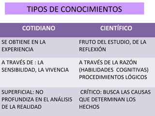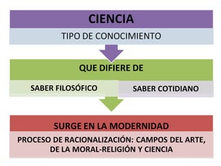 El documento analiza diferentes tipos de conocimientos, destacando las diferencias entre el conocimiento cotidiano y el científico, así como su transmisión y verificación. Se discute el impacto histórico del conocimiento científico, desde el iluminismo hasta las revoluciones políticas y económicas, así como la importancia de la razón en el progreso social. Finalmente, se menciona el capitalismo como sistema económico fundamental en la sociedad moderna.