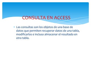 Este documento describe los diferentes tipos de consultas en Access, incluyendo consultas de selección para recuperar datos, consultas de acción para modificar datos, y consultas SQL específicas. Explica cómo crear una consulta básica seleccionando campos y tablas, y cómo guardar y ejecutar la consulta. También menciona otros tipos como consultas de parámetros, multitabla, de alineación y creación de tablas.