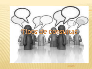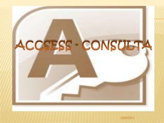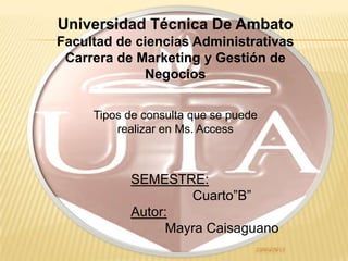 Existen cuatro tipos de consultas de comandos en MS Access: creación de tablas, alineación, actualización y eliminación. Las consultas de parámetros muestran una ventana de diálogo al ejecutarse para solicitar información. Las consultas de búsqueda de duplicados encuentran registros repetidos en una tabla.