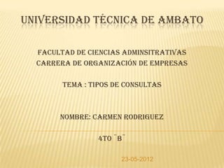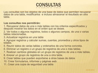 Este documento describe los diferentes tipos de consultas en una base de datos, incluyendo consultas de selección, consultas con parámetros, consultas de referencias cruzadas y consultas de acción como consultas de creación de tablas, actualización, eliminación y datos anexados. Explica los pasos para crear cada tipo de consulta y sus usos.