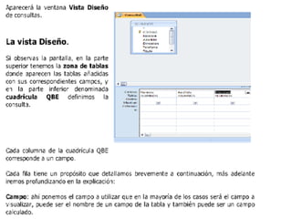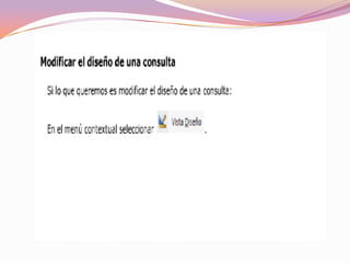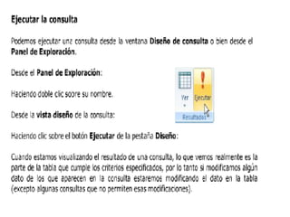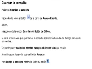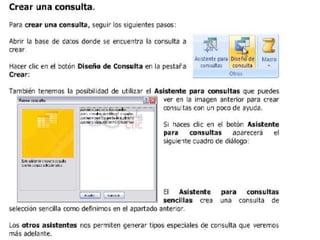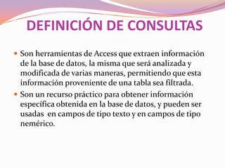 Las consultas en Access extraen y filtran información de las tablas de una base de datos. Existen tres tipos principales de consultas: consultas de selección que muestran datos según criterios, consultas de referencias cruzadas que muestran datos de múltiples tablas, y consultas de acción que realizan cambios como eliminar, actualizar o añadir registros.