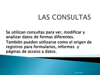 El documento describe los diferentes tipos de consultas en Microsoft Access, incluyendo consultas de selección, consultas con parámetros, consultas de referencias cruzadas, y consultas de acción como consultas de eliminación, actualización, anexado y creación de tablas. También describe el uso de lenguaje SQL para crear consultas.