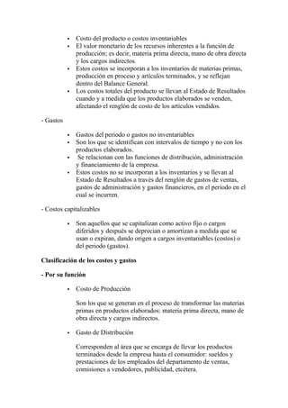 Este documento define la contabilidad de costos y proporciona conceptos generales sobre costos y gastos. Explica que la contabilidad de costos es un sistema de información para predeterminar, registrar, acumular, distribuir, controlar, analizar, interpretar e informar los costos de producción, distribución, administración y financiamiento de una empresa. También diferencia entre costos y gastos, y clasifica los costos y gastos por función, identificación, periodo en que se llevan al estado de resultados, grado de variabilidad y momento en que se