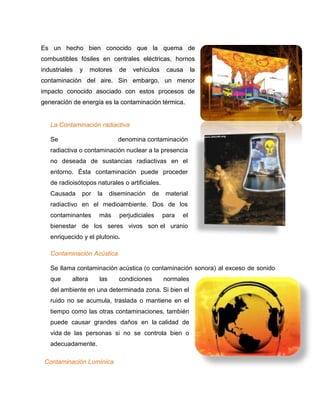 El documento describe varios tipos de contaminación: la contaminación del agua que implica la contaminación de cuerpos de agua; la contaminación del aire que involucra sustancias o energías que representan riesgos para personas y bienes; la contaminación del suelo que se refiere a la acumulación de sustancias tóxicas; la contaminación térmica asociada con la generación de energía; la contaminación radiactiva por la diseminación de materiales radiactivos; la contaminación acústica por el exceso de sonido; y la contaminación lumínica que