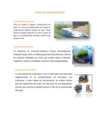 El documento describe los diferentes tipos de contaminación: contaminación del agua, del aire, del suelo, térmica, radiactiva, acústica y lumínica. La contaminación del agua se refiere a la contaminación de cuerpos de agua, mientras que la contaminación del aire implica la presencia de sustancias o energía dañinas en el aire. La contaminación del suelo es la acumulación de sustancias tóxicas en el suelo. Las otras formas de contaminación incluyen la térmica por la quema de combustibles, la radi