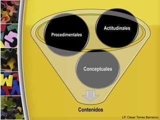 Este documento describe tres tipos de contenidos educativos: conceptual, procedimental y actitudinal. El contenido conceptual incluye datos, hechos, conceptos y principios. El contenido procedimental se refiere a la adquisición de habilidades y destrezas mediante la práctica. El contenido actitudinal busca desarrollar valores y actitudes positivas a través de experiencias.