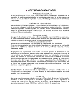 Este documento contiene ejemplos de tres tipos de contratos: 1) Contrato de capacitación que establece los términos de un programa de capacitación laboral. 2) Contrato de consultoría que define los servicios de consultoría, plazos y pagos. 3) Contrato de desarrollo de software que especifica las obligaciones de las partes en el desarrollo e implementación de un sistema de software.