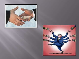 Este documento describe diferentes tipos de corrupción, incluyendo extorsión, soborno, peculado, colusiones, fraude y tráfico de influencias. También discute la falta de ética como un tipo especial de corrupción que va en contra de los valores e instituciones públicas. El documento analiza la corrupción desde sus implicaciones sociales y cómo puede sostener estructuras de poder.