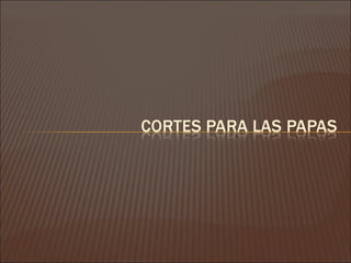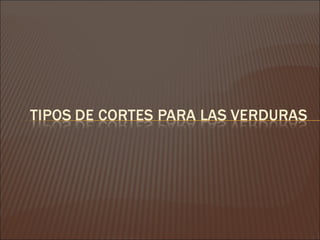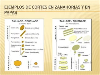 Este documento describe diferentes técnicas de corte de vegetales y otros ingredientes culinarios. Explica cortes como juliana, brunoise, rodajas, y mirepoix, así como técnicas para el ajo como picado, ecrase, y en camisa. También cubre cortes para papas como croquetas y papa paja.