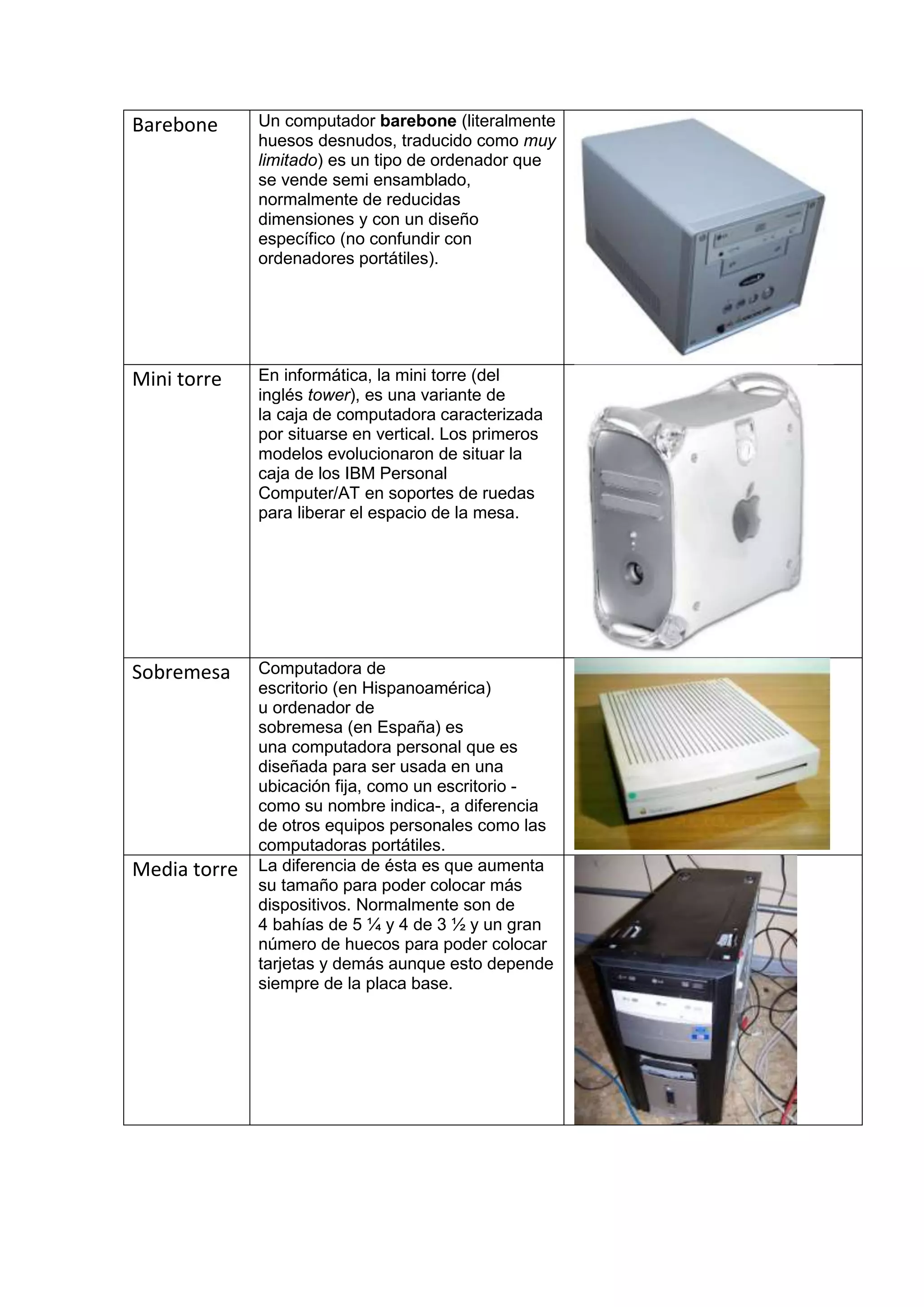 Este documento define y describe diferentes tipos de computadoras, incluyendo computadoras barebone (muy limitadas), mini torres, de sobremesa, media torre, racks, modding y portátiles. Define cada tipo por su tamaño, diseño y capacidad de almacenamiento y movilidad.