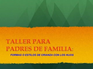 Este documento describe cuatro estilos principales de crianza de hijos: autoritario, permisivo, negligente y democrático. Los padres autoritarios ejercen mucho control y disciplina estricta pero poco afecto, mientras que los permisivos dan poco control y disciplina. Los negligentes dan poco de ambos. Los democráticos establecen expectativas claras con explicaciones y afecto, obteniendo los mejores resultados para los niños. El documento también ofrece consejos como tratar a los hijos con respeto y animar su autoestima.