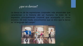 Este documento describe diferentes tipos de danzas como el break dance, dubstep, hip hop, bachata, dancehall, tango, vals, rumba y manbo. Luego procede a definir brevemente cada uno de estos estilos de baile, incluyendo detalles sobre su origen y características musicales.