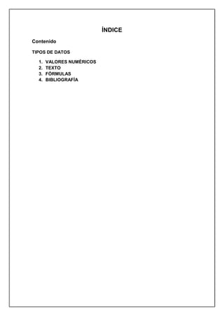 Este documento describe los tres tipos de datos que se pueden ingresar en Excel: valores numéricos, texto y fórmulas. Los valores numéricos incluyen números y fechas, que Excel almacena como valores numéricos aunque se pueden formatear de diferentes maneras. El texto se alinea a la izquierda y puede incluir letras, números o símbolos. Las fórmulas calculan resultados usando valores numéricos y de texto.