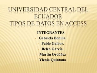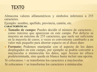 Este documento describe los diferentes tipos de datos en Access como texto, número, fecha/hora y moneda. Para cada tipo de dato, se especifican sus características como formato, título, valor predeterminado, reglas de validación, entre otras. El objetivo es explicar las opciones de configuración disponibles para cada tipo de dato al definir los campos de una tabla en Access.