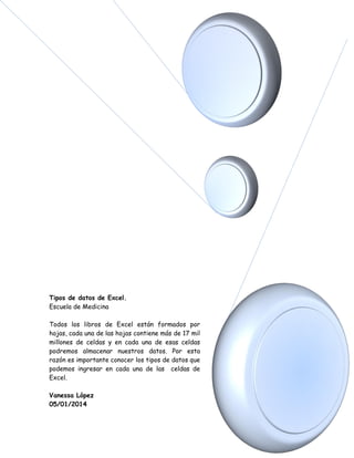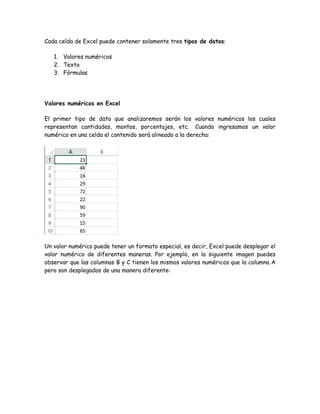 Este documento describe los tres tipos de datos que pueden almacenarse en las celdas de Excel: valores numéricos, texto y fórmulas. Los valores numéricos incluyen cantidades, montos y fechas (que internamente son almacenadas como valores numéricos). El texto incluye cadenas alfanuméricas y símbolos. Las fórmulas usan valores y texto para realizar cálculos y devolver resultados.