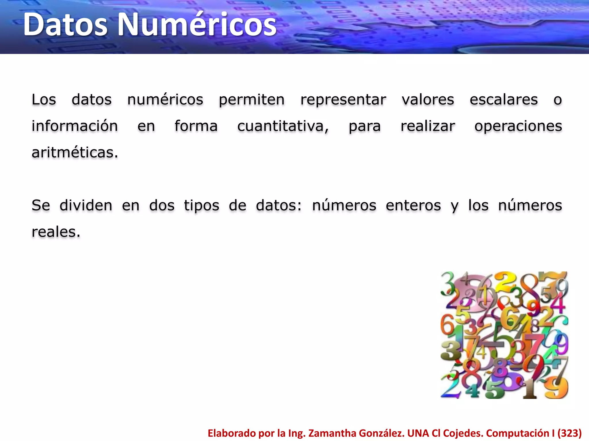 Este documento describe diferentes tipos de datos numéricos y no numéricos. Explica que los datos numéricos incluyen enteros como byte, shortint e integer, y reales como real, single y double. También cubre datos lógicos booleanos y caracteres individuales char y cadenas de caracteres string.