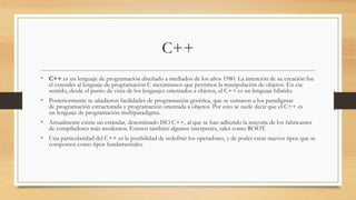 Los tipos de datos en C++ incluyen enteros (short, int, long), números en coma flotante (float, double, long double), caracteres, booleanos y vacío. Los tipos derivados se forman a partir de los tipos primitivos y pueden incluir clases y objetos. Cada tipo de dato primitivo ocupa un número específico de bits dependiendo de la arquitectura, y los tipos se pueden modificar con signed, unsigned, short y long para variar el rango y tamaño.