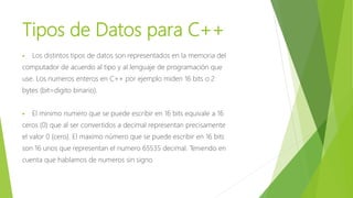 Este documento describe los diferentes tipos de datos en C++, incluyendo enteros (short, int, long), reales (float, double, long double), lógicos (bool) y caracteres (char, wchar_t). Explica los rangos y tamaños típicos de cada tipo de dato. También cubre conceptos como la declaración y asignación de nombres a variables.