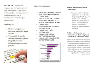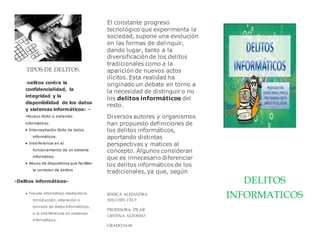 Este documento describe diferentes tipos de delitos informáticos como el acceso ilícito a sistemas, la interceptación de datos y la interferencia en sistemas. También discute si los delitos informáticos deben considerarse como una categoría separada o no de los delitos tradicionales. Por último, presenta algunas leyes colombianas relacionadas con delitos informáticos como el acceso abusivo a sistemas y la violación de datos personales.