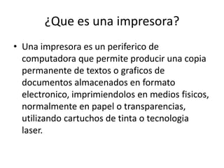 Este documento resume diferentes tipos de impresoras, incluyendo impresoras de matriz de puntos, chorro de tinta, láser y plotter. Explica que una impresora produce copias permanentes de documentos electrónicos en papel u otras superficies, y describe cómo funcionan los diferentes tipos de impresoras. Recomienda comprar una impresora láser y mantenerla limpiando el exterior e interior para evitar problemas de impresión.