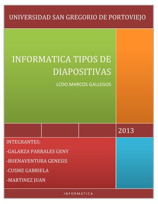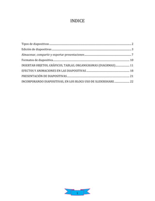 Este documento describe los tipos de diapositivas y cómo editarlas, almacenarlas, compartirlas y exportarlas. Explica que hay diapositivas de texto, tablas, diagramas y blancas, y cómo cambiar el color de fondo y agregar imágenes. También cubre cómo asignar etiquetas, desplazarse entre diapositivas, y editar texto grabado. Por último, habla de guardar presentaciones, compartirlas en línea y exportarlas a formatos como PDF.