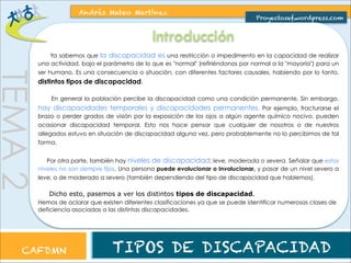 El documento aborda la discapacidad desde una perspectiva general y detalla los diferentes tipos de discapacidad, que incluyen discapacidad intelectual, física y sensorial. Se enfatiza la necesidad de adaptaciones en el ámbito educativo y deportivo para personas con discapacidad visual y auditiva, destacando la importancia de métodos y materiales específicos para facilitar su inclusión. Además, se mencionan las características y clasificaciones que afectan la percepción y motricidad de estas personas debido a sus condiciones.