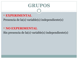 Este documento describe los tipos de diseños experimentales y no experimentales en la investigación. Los diseños experimentales implican la manipulación intencional de variables independientes y permiten medir sus efectos con control y validez interna. Los diseños no experimentales no manipulan variables y pueden ser transversales u longitudinales para analizar fenómenos en un momento o a través del tiempo respectivamente.