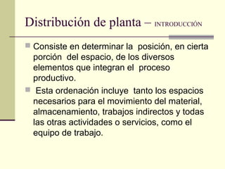 Existen cuatro tipos principales de distribución en planta: por producto, por proceso, por grupo o célula de fabricación y por posición fija. La distribución por producto es adecuada para la fabricación de grandes cantidades de productos muy normalizados, mientras que la distribución por proceso se escoge cuando la producción se organiza por lotes. La distribución por grupo o célula de fabricación combina las ventajas de las distribuciones por proceso y por producto, y la distribución por posición fija se emplea fundamentalmente en proyect